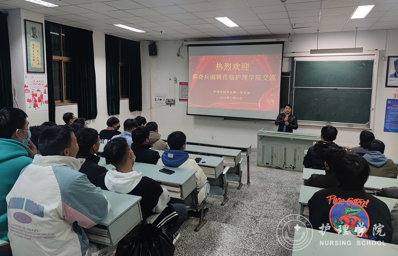 11月25日,为深刻贯彻落实“我为群众办实事”,进一步推动党史学习教育在实践中发挥成效。YABO鸭脖学生第一党支部特别邀请《护士进修杂志》编辑蔡奇兵为鸭脖全体在校男护生作交流,即在专业思想引领、实习及就业指导等方面释疑解惑。学院党委书记杨英莅临指导,全体在校男护生线上线下参会。会议由学生第一党支部书记杨叶卿主持。