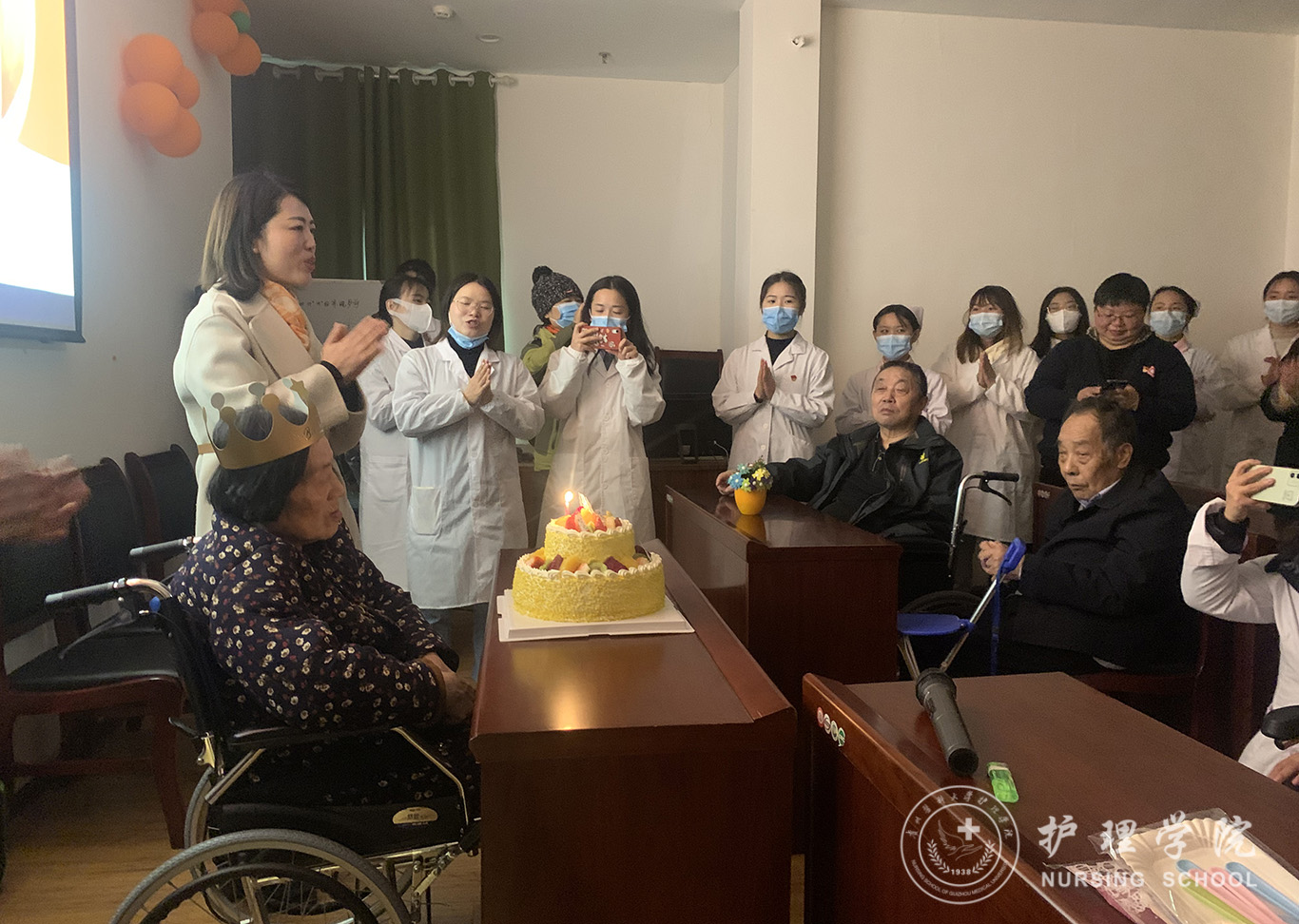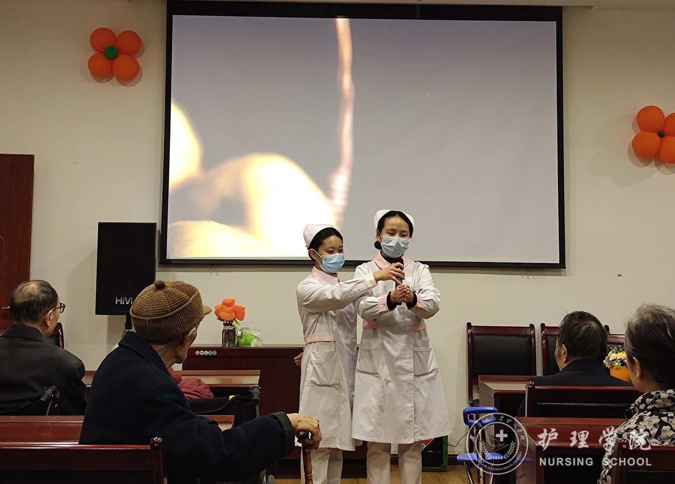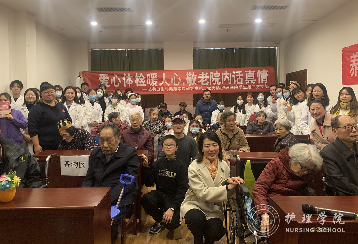 活动中,学生党员耐心细致地为老年人们科普医学知识,生动形象地演示了“七步洗手法”与“海姆立克急救法”的操作技能。同时,学生党员细心地为老年人测量血压,并对血压偏高、有高血压病史的老人给予健康提示与知识宣讲。随后,党员代表们为恰逢今天过生日的老奶奶送上了生日祝福,与她共度今日的美好时光,同时为老人们一一送上慰问品。活动最后,党员代表们聆听了在日间照料中心疗养的老党员们讲述他们的入党故事,让同学们在精神上受到了洗礼。