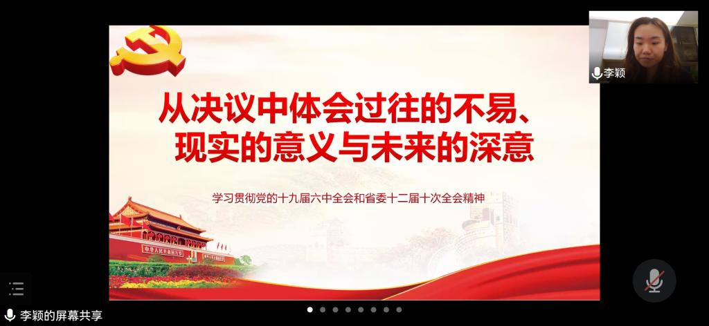 1月22日,为深入学习贯彻党的十九届六中全会精神和省委十二届十次全会精神,引导学生党员认真学习,领悟全会精神实质,YABO鸭脖党委委员、综合办公室副主任李颖以“从决议中体会过往的不易、现实的意义与未来的深意”为主题为YABO鸭脖学生第二党支部全体党员作了线上宣讲,会议由支部书记刘文壮主持,支部全体党员参加本次宣讲会。