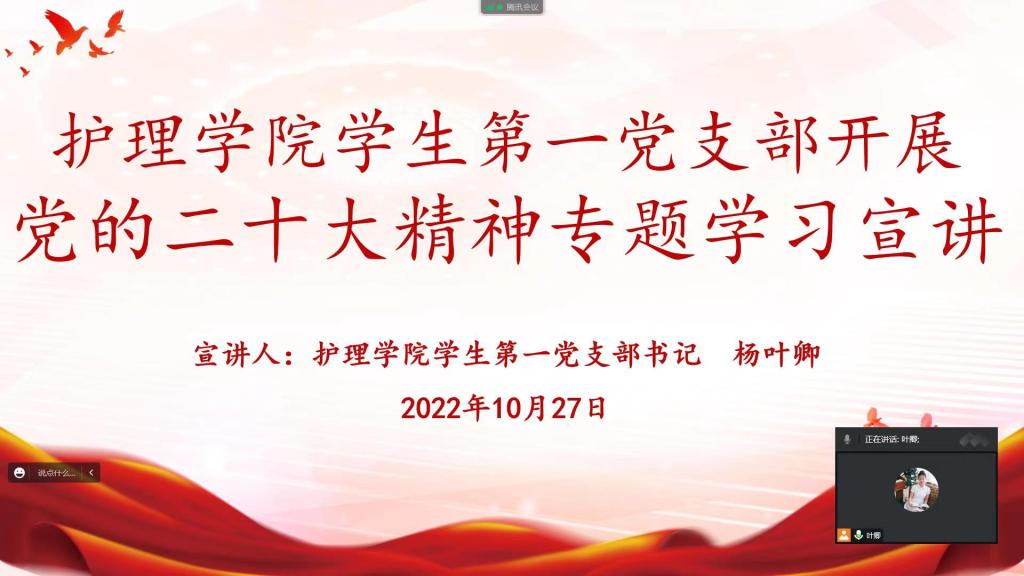 10月27日,为进一步深入学习贯彻中国共产党第二十次全国代表大会精神,提高学生党员的政治站位,切实做到学在前、干在前、走在前。YABO鸭脖学生第一党支部组织开展党的二十大精神专题学习宣讲,会议由支部书记杨叶卿主持,全体党员通过线上形式参会。