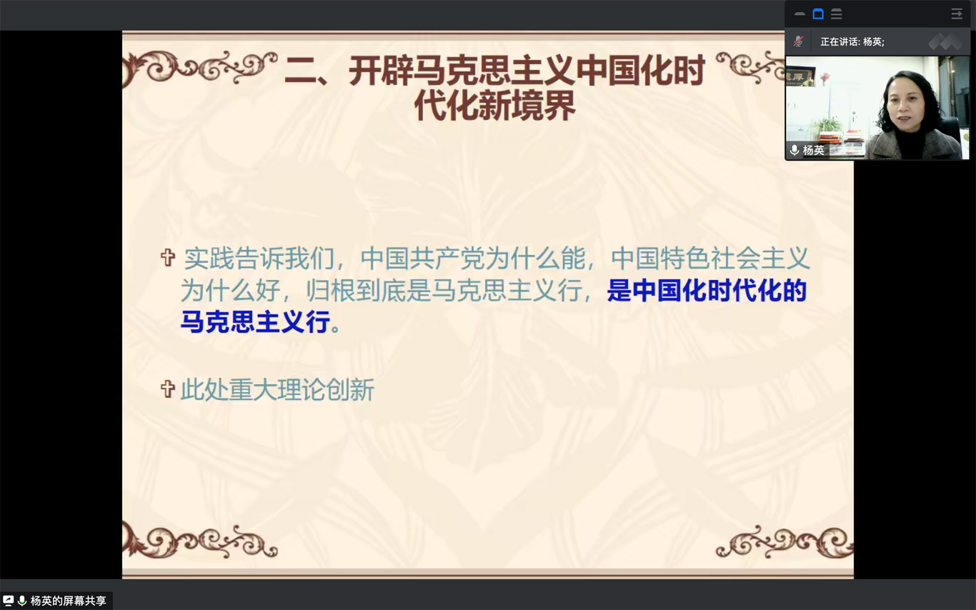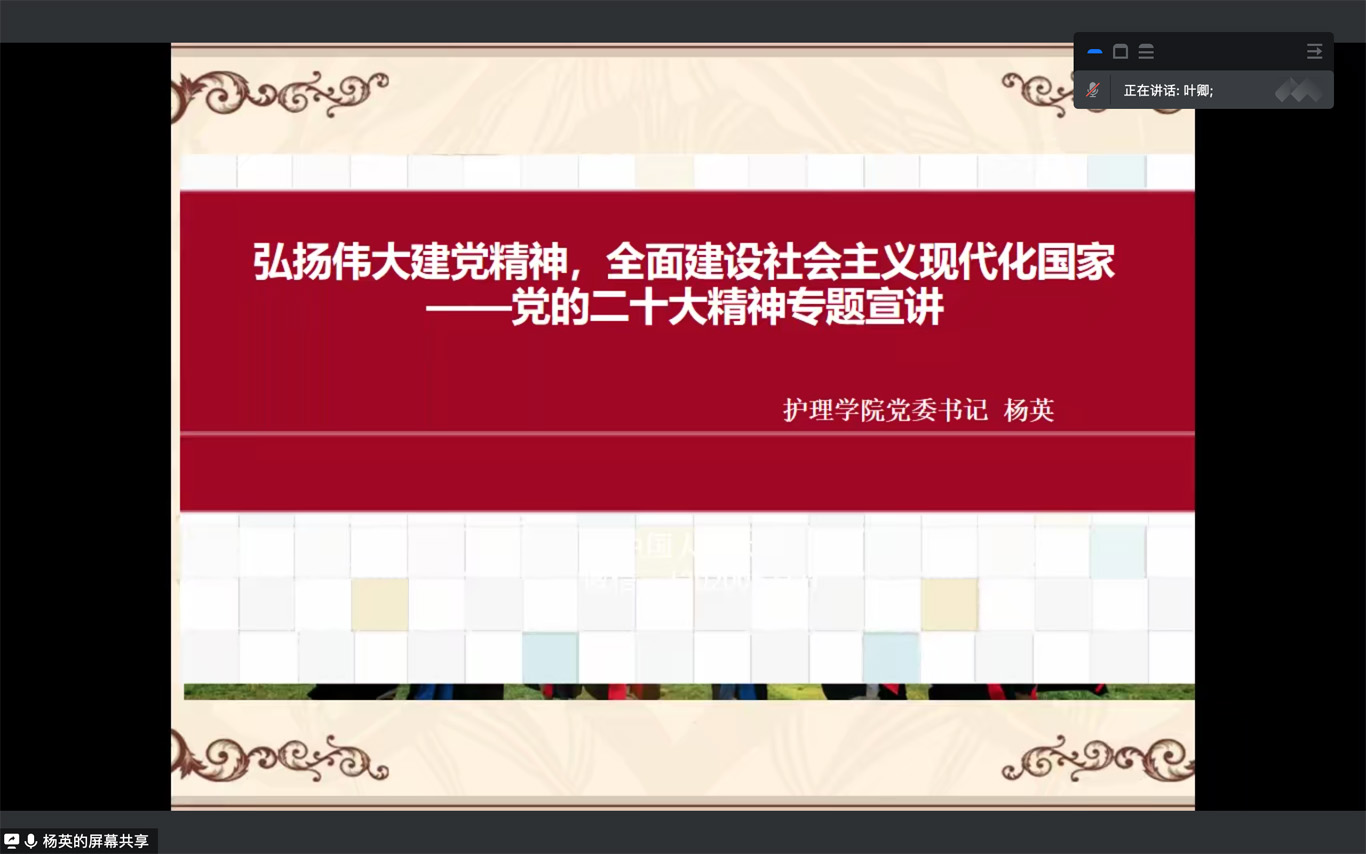 12月10日,为深入学习贯彻党的二十大精神,引导学生党员认真学习,领悟精神实质,YABO鸭脖党委书记杨英以“弘扬伟大建党精神,全面建设社会主义现代化国家”为主题在YABO鸭脖学生第一党支部宣讲党的二十大精神,会议由支部书记杨叶卿主持,全体支部党员、 入党积极分子通过腾讯会议参加本次宣讲。