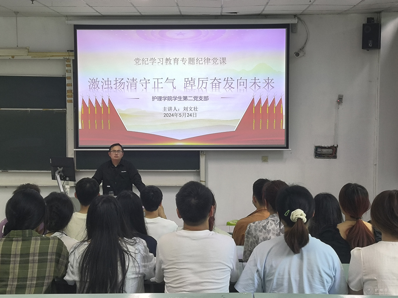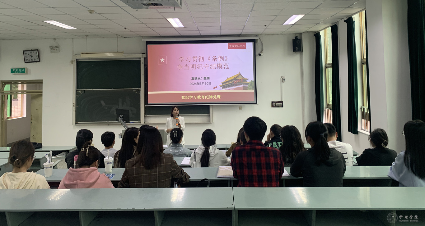 学院副处级组织员张黎,教职工党支部书记张仁莉,学生党支部书记梁子豪、刘文壮、刘妍分别以《学习贯彻<条例>争当明纪守纪模范》《学习<条例>遵守纪律行稳致远》《深化党纪学习教育,筑牢忠诚纪律防线》《激浊扬清守正气踔厉奋发向未来》《严守党的政治纪律和政治规矩》为主题为各支部党员讲授纪律党课。