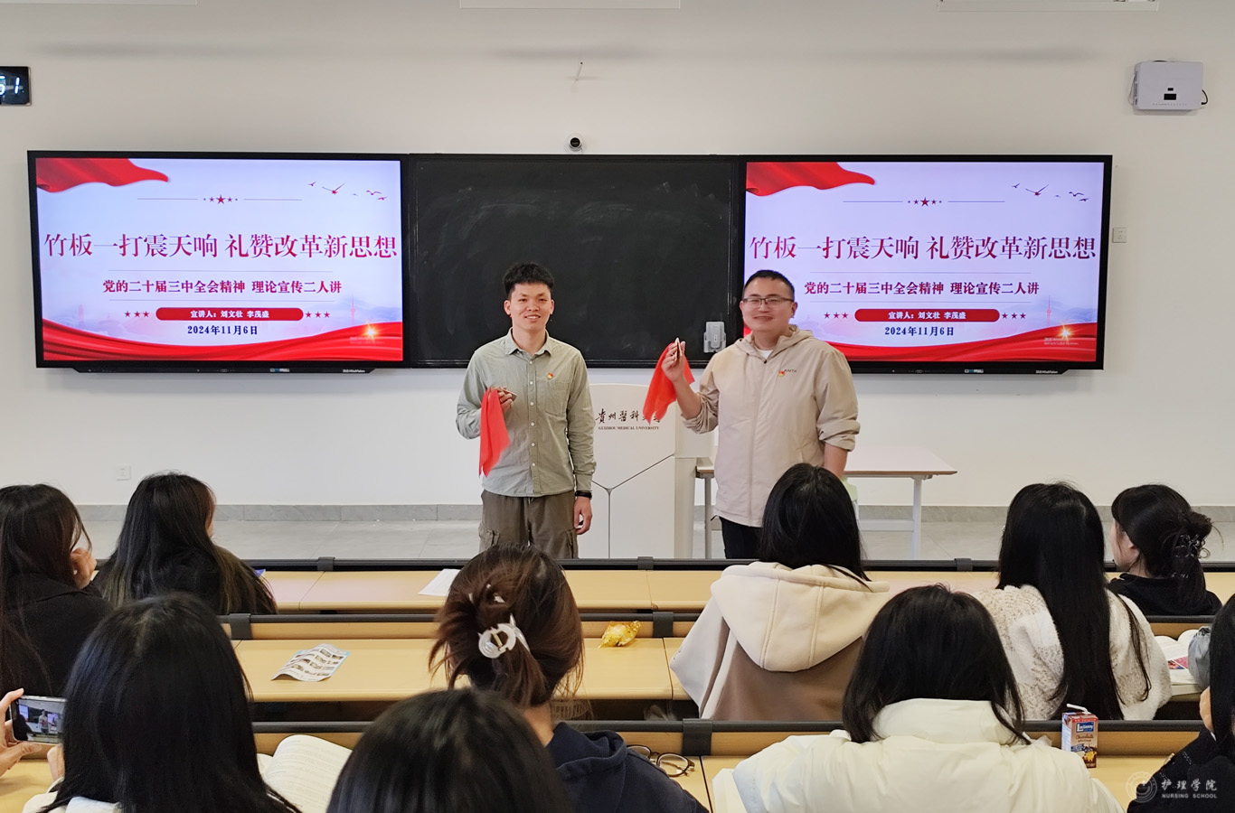 近日,YABO鸭脖2023级各班课余传出了阵阵清脆的快板声,一场场别开生面的理论宣传活动正在这里热烈展开。此次活动是YABO鸭脖辅导员刘文壮、李茂盛两位同志用“二人讲”形式开展的党的二十届三中全会精神宣讲,创新用传统快板融入党的理论宣讲的方式,吸引了众多学生的兴趣。